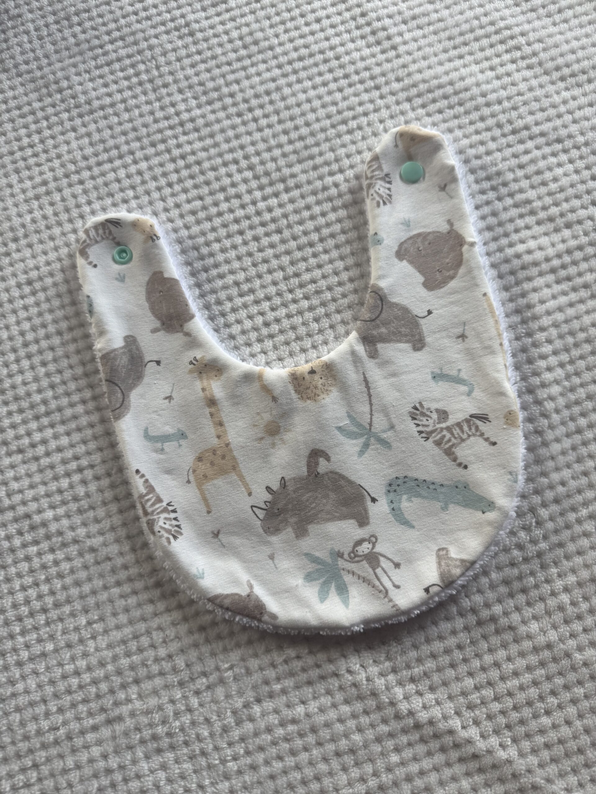 Le bavoir est réalisé pour les petits bébés car étant petit il est bien adapté pour les biberon ou la bave. Il ne sera par contre pas adapté lorsqu’il commenceront à manger à la cuillière ou plus. Il est proposé en taille 0-9mois. Il se ferme à l’aide d’une pression en plastique pour assurer un bon maintient.