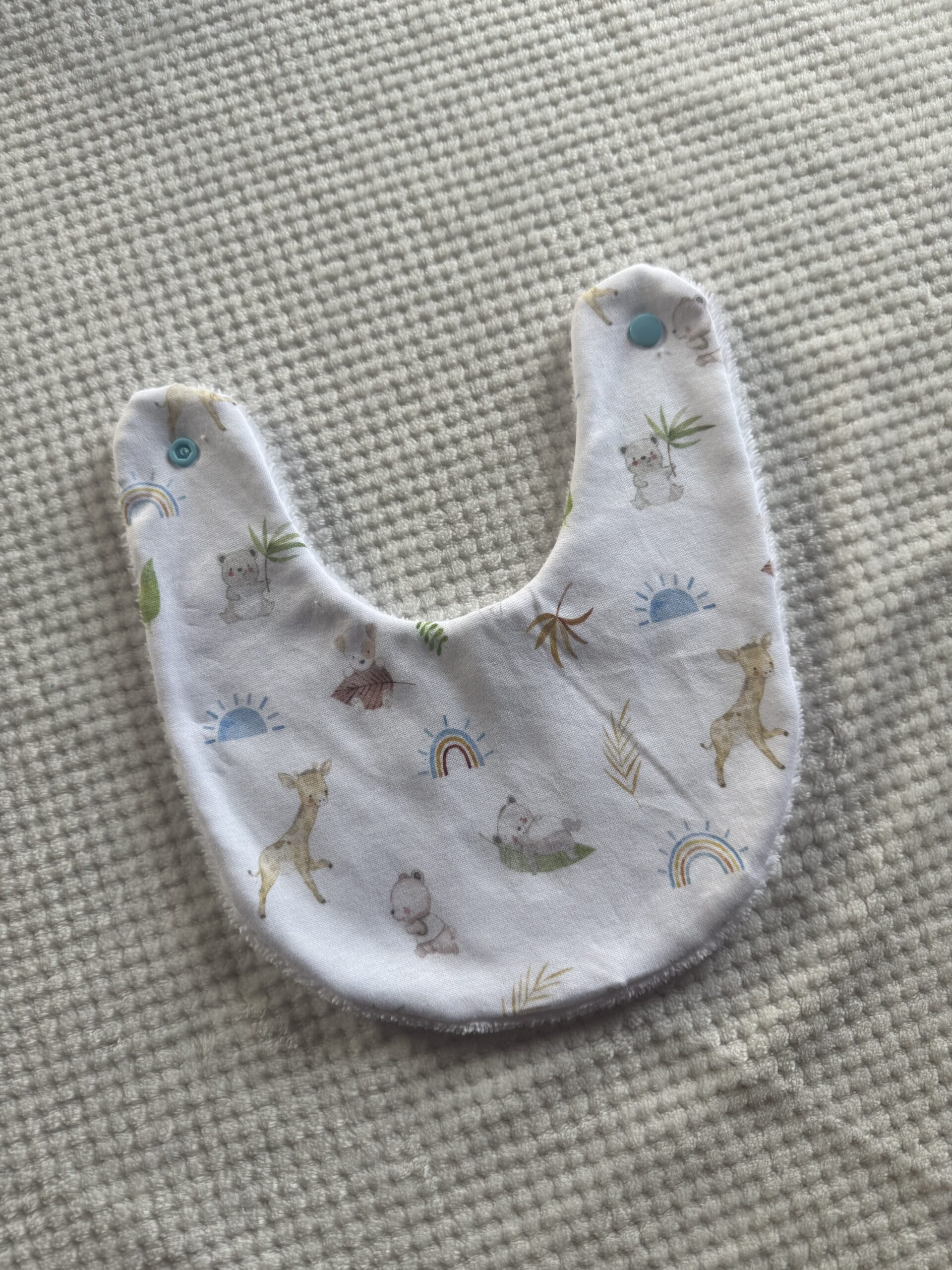 Le bavoir est réalisé pour les petits bébés car étant petit il est bien adapté pour les biberon ou la bave. Il ne sera par contre pas adapté lorsqu’il commenceront à manger à la cuillière ou plus. Il est proposé en taille 0-9mois. Il se ferme à l’aide d’une pression en plastique pour assurer un bon maintient.