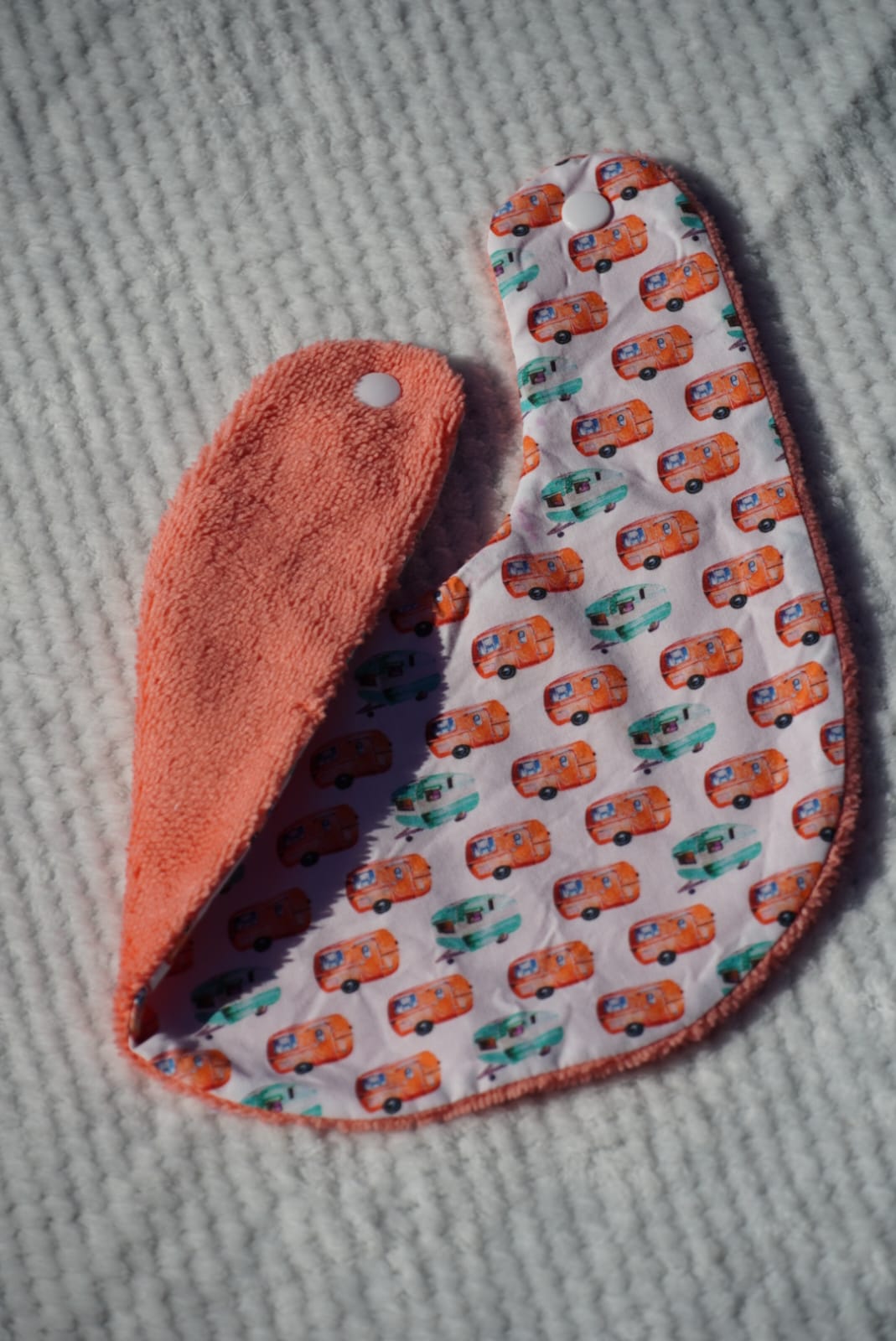 Le bavoir est réalisé pour les petits bébés car étant petit il est bien adapté pour les biberon ou la bave. Il ne sera par contre pas adapté lorsqu’il commenceront à manger à la cuillière ou plus. Il est proposé en taille 0-9mois. Il se ferme à l’aide d’une pression en plastique pour assurer un bon maintient.